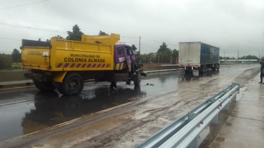 RÍO TERCERO/ AUTOVÍA. Hoy cerca de las 9 de la mañana, en la autovía que une la ciudad de Río Tercero con la de Almafuerte, mano saliente, y con condiciones complicadas como la carpeta asfáltica mojada, se produjo un accidente donde un camión chocó de atrás al otro.