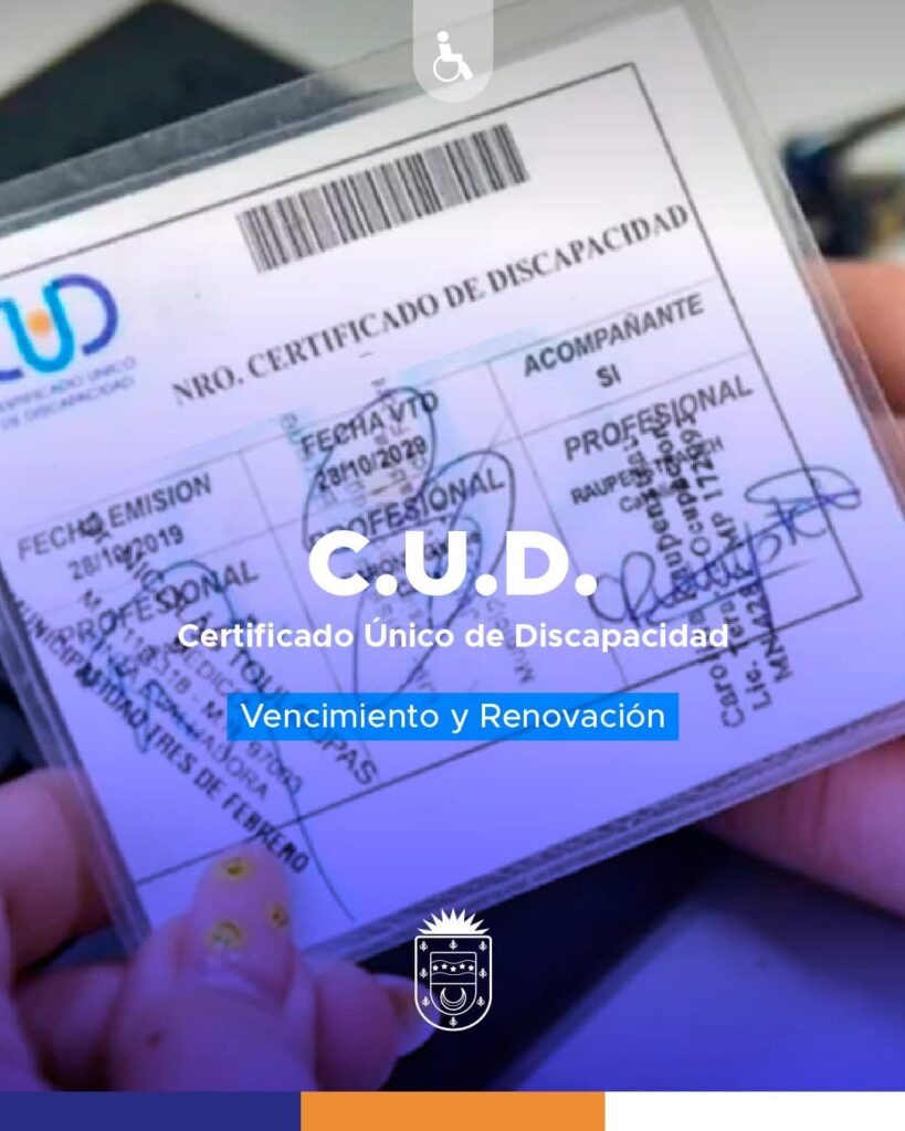 Importante: Los CUD que vencen en 2025 se renuevan automáticamente, por lo que su nueva fecha de vencimiento será en 2026. Para más información, comunicarse con la Dirección de Discapacidad al teléfono 412104 o al whatsApp: 3571632024 o dirigirse a Mitre 664