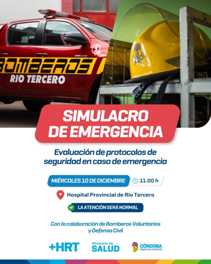 RÍO TERCERO – Este miércoles 10 de diciembre, las inmediaciones del Hospital Provincial de Río Tercero serán escenario de un importante despliegue operativo. Sin embargo, no se trata de una crisis real, sino de un simulacro de incendio programado para las 11:00 horas, diseñado para evaluar y fortalecer la capacidad de respuesta ante situaciones críticas.